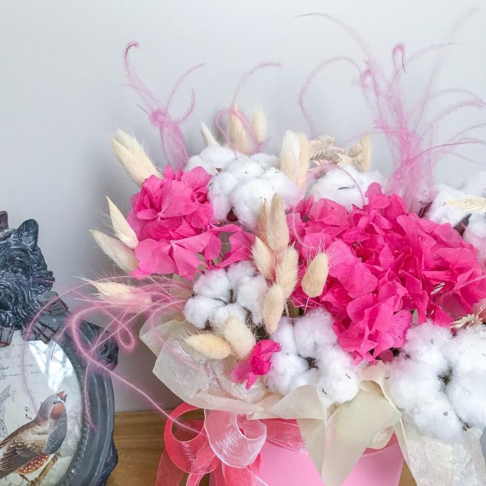 Гортензия – 1 шт.Хлопок натуральный – 7 шт.Лагурус (сухоцвет) – 25 шт.