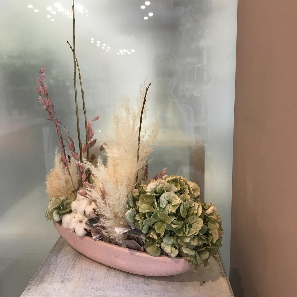 Кашпо керамическое – 1 шт.пена флористическая oasis – 1 шт.Гортензия – 2 шт.Хлопок – 5 шт.Эвкалипт – 1 шт.хасматиум – 4 шт.Мох стабилизированный – 1 шт.пампасная трава (сухоцвет) – 1 шт.