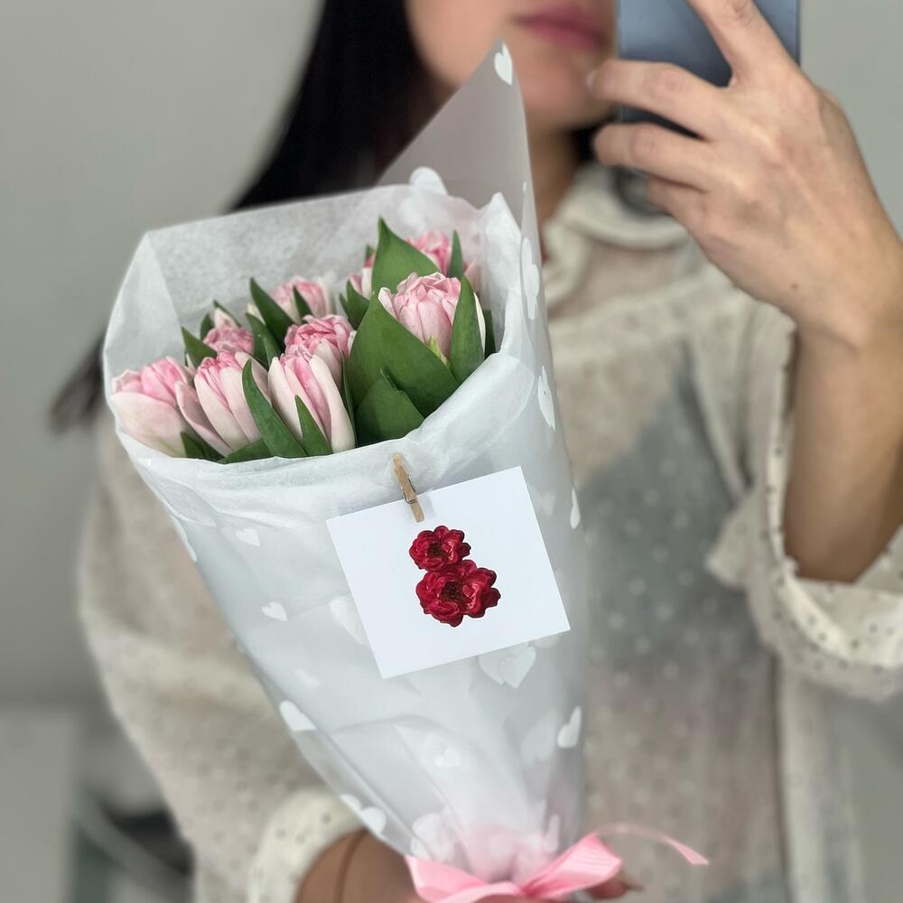Упаковка – 2 шт.Лента атласная – 1 шт.Открытка – 1 шт.Тюльпан пионовидный – 9 шт.