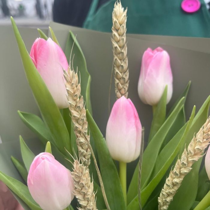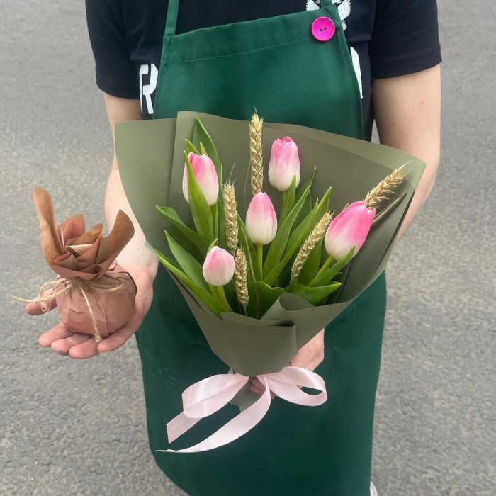 РОЗОВАЯ СВЕЖЕСТЬ оригинальный набор из тюльпанов с пшеницей и ароматным яблоком