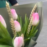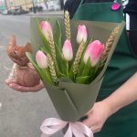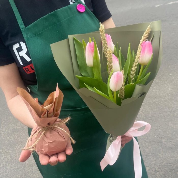 Крафт – 1 шт.Тюльпан розовый – 5 шт.Упаковка корейская пленка – 1 шт.Лента атласная нежно-розовая – 1 шт.бечевка натуральная – 1 шт.пшеница сухоцвет – 5 шт.